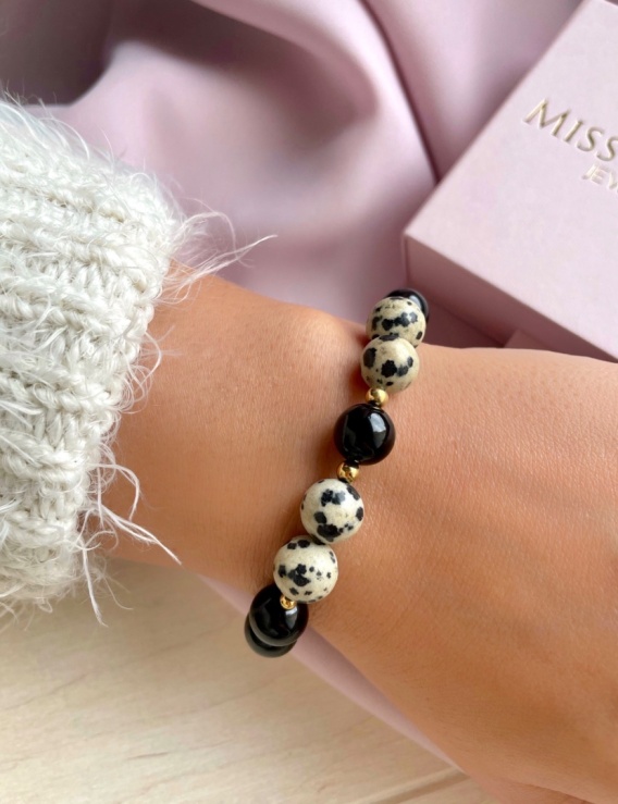 Czarny onyks symbolizuje siłę, pewność siebie i elegancję, a jaspis dalmatyński wnosi równowagę, energię i odrobinę lekkości. Razem tworzą duet idealny – wyrazisty, ale wciąż subtelny.